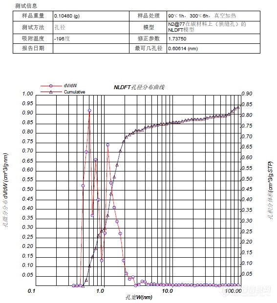 此外,用NLDFT非定域密度泛函理论来对其全孔径进行分析,如图5所示,通过YY.VIPNLDFT全孔径模型分析可知,其总孔容分别为:YY.VIP0.84cm