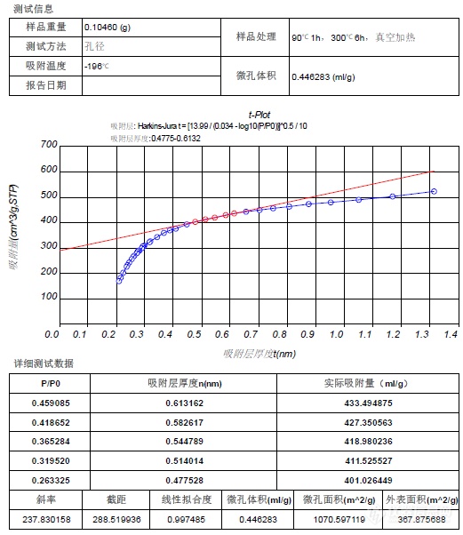 两种多孔碳骨架材料(上:1#,下:2#)的t-plot法微孔面积测试结果